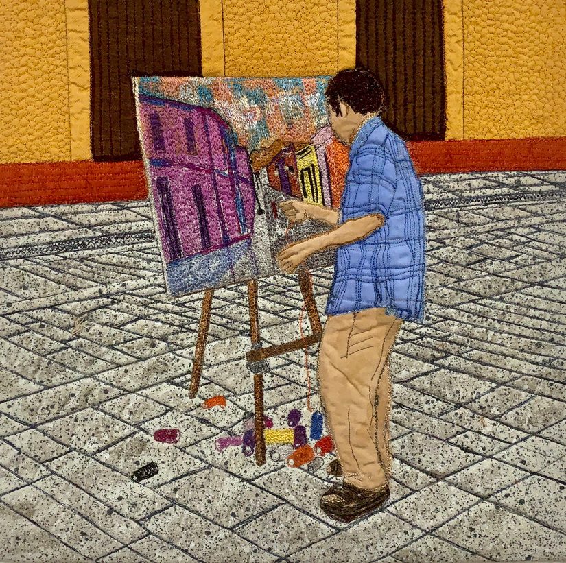 I photographed an artist in Oaxaca, Mexico who was thread painting en plein air along a city street. He used assorted threads to recreate the scene he could see down the street in his line of vision. Referencing my photographs, I thread painted the image of this man onto a silk and cotton background.